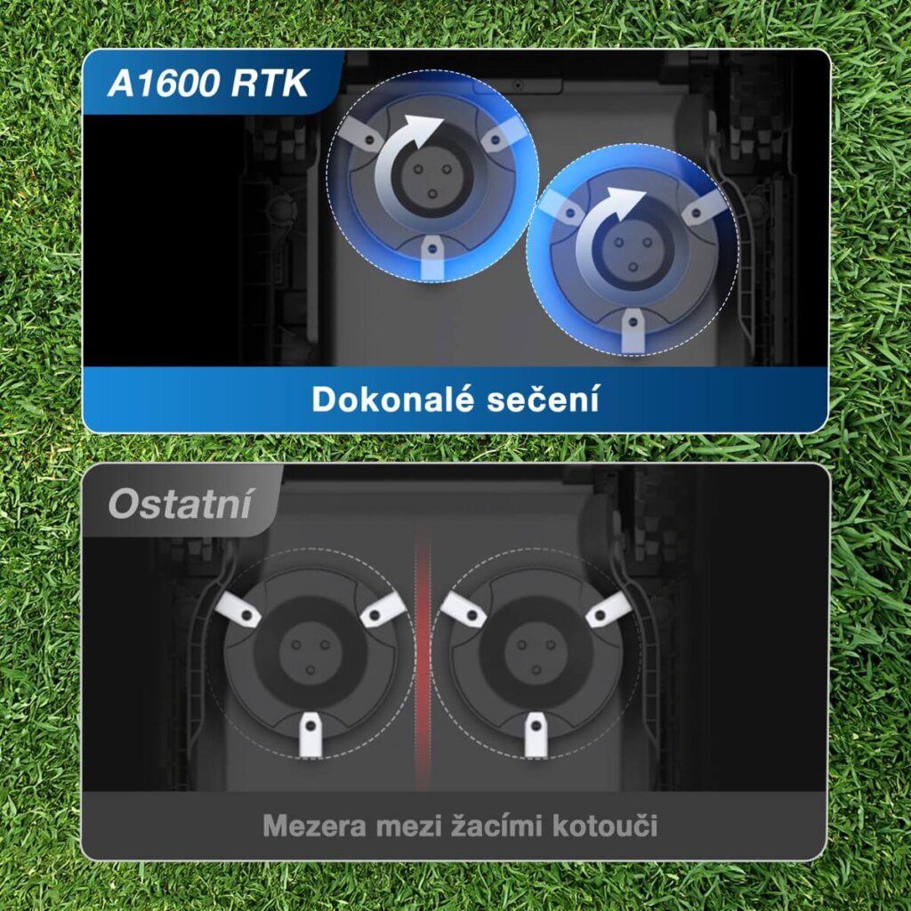 Robotická sekačka ECOVACS GOAT A1600 RTK používá jedinečnou RTK navigaci vylepšenou o 3D LiDAR a AI kameru typu rybí oko s přesností polohování 2 cm. Nejnovější multifrekvenční RTK technologie dokáže najednou přijímat signál až ze 45 satelitů s navýšeným počtem signálových pásem až o 80 %. Přináší také 4-násobnou rychlost připojení a 30 % zvýšení stability připojení v zastíněných oblastech.