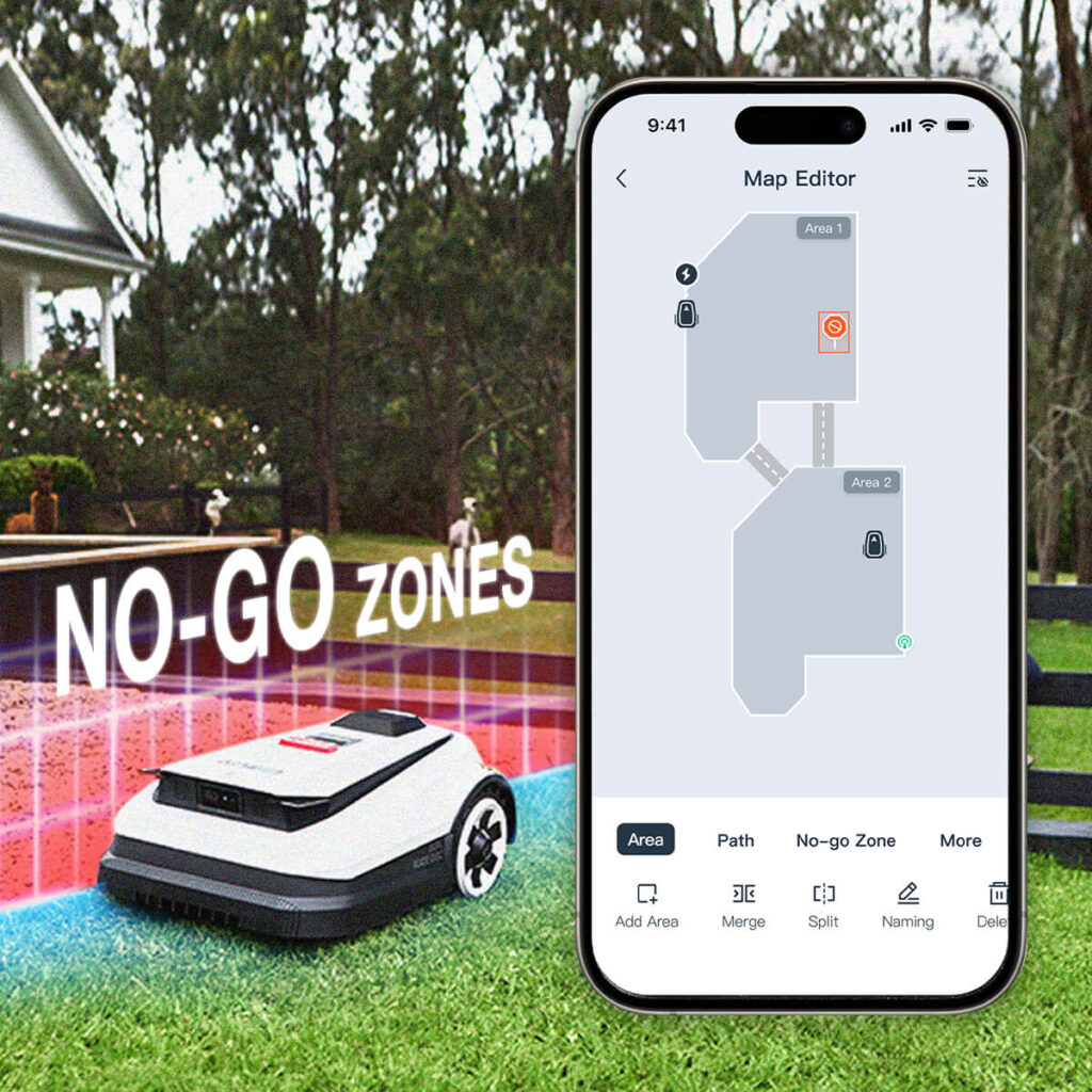 Pokud se výsledek automatického mapování liší od očekávání, mapu lze upravit přidáním, sloučením, rozdělením nebo odstraněním oblastí. Rovněž je možné nastavit několik cest, kterými se bude robotická sekačka ECOVACS GOAT A3000 LiDAR pohybovat mezi oblastmi a No-go zóny, do kterých robotická sekačka nebude vstupovat.