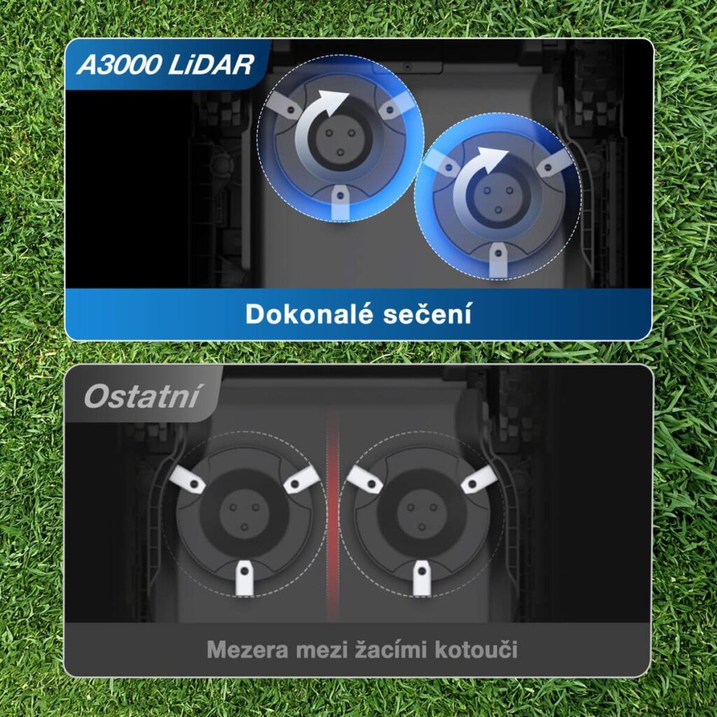 Robotická sekačka ECOVACS GOAT A3000 LiDAR s podporou AI Deep Learning dokáže v reálném čase rozlišit travnatou plochu od netravnaté. Na hranici sečení zároveň rozezná, zda se jedná o ohraničení, po kterém může jezdit. Při sjízdném ohraničení, jako je například dlažba, bude robotická sekačka jednou stranou přejíždět přímo po ní, a tak na okrajích nezanechá ani jedno stéblo neposečené trávy.
